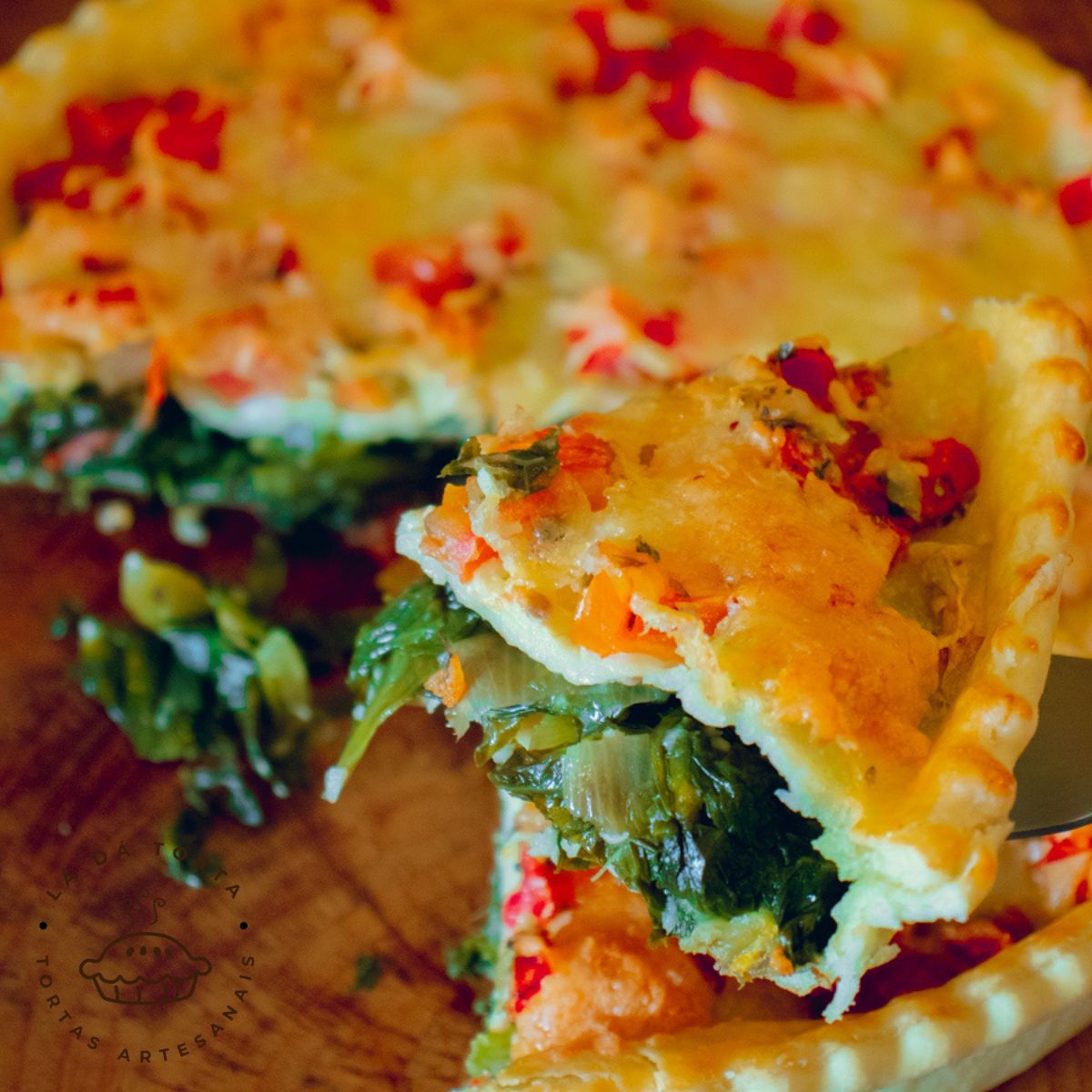 Torta de escarola com azeitonas verdes, tomate temperados e parmesão.