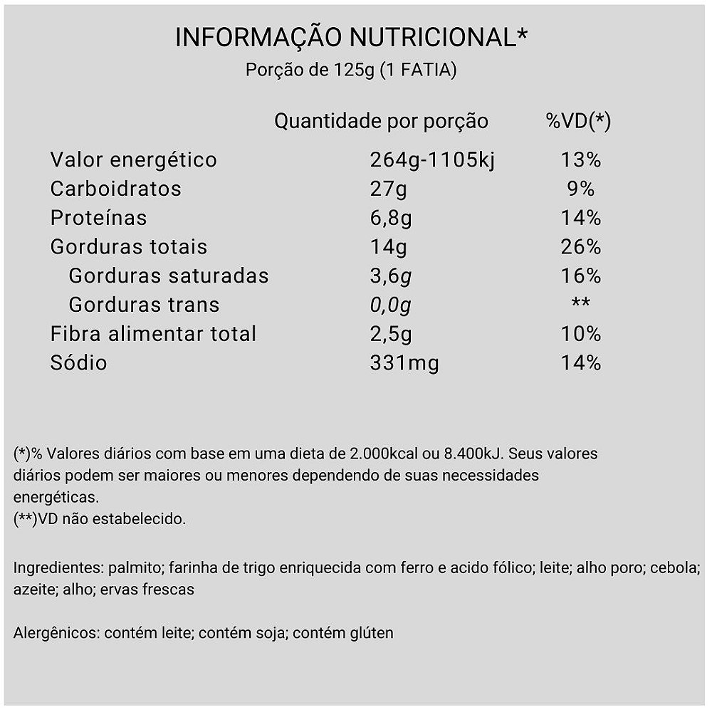 Recheio pedaçudo, com pedaços de palmito pupunha. Refogado caprichado com os sabores do alho poró, do azeite, do carinho que usamos em nossa cozinha e um creme para agregar todos os ingredientes feito com bastante amor.